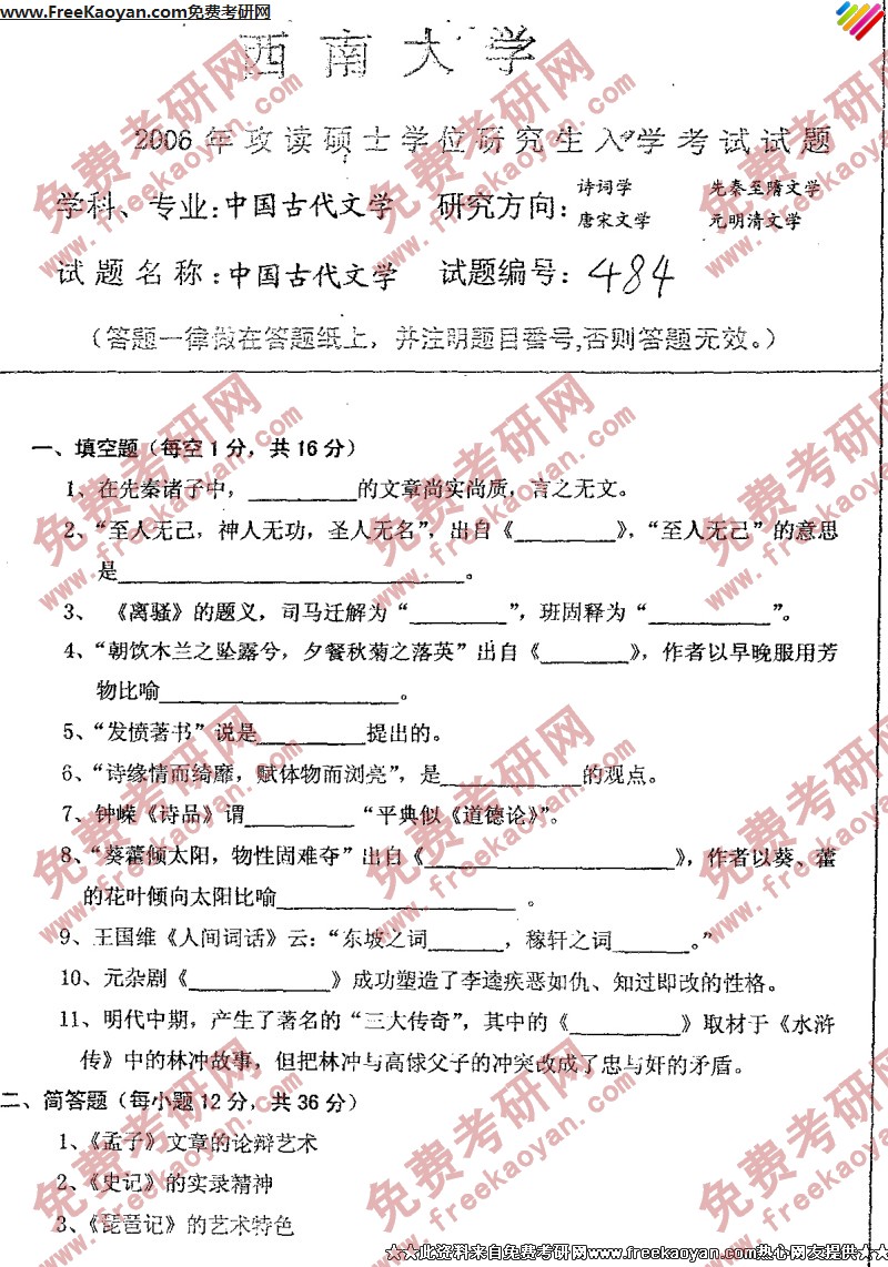 西南大学2006年半岛在线注册真题-中国古代文学