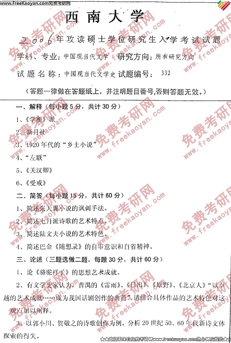 专业课半岛在线注册经验 本站小编 FreeKaoyan 2018-01-23西南大学2006年半岛在线注册真题-中国古代文学