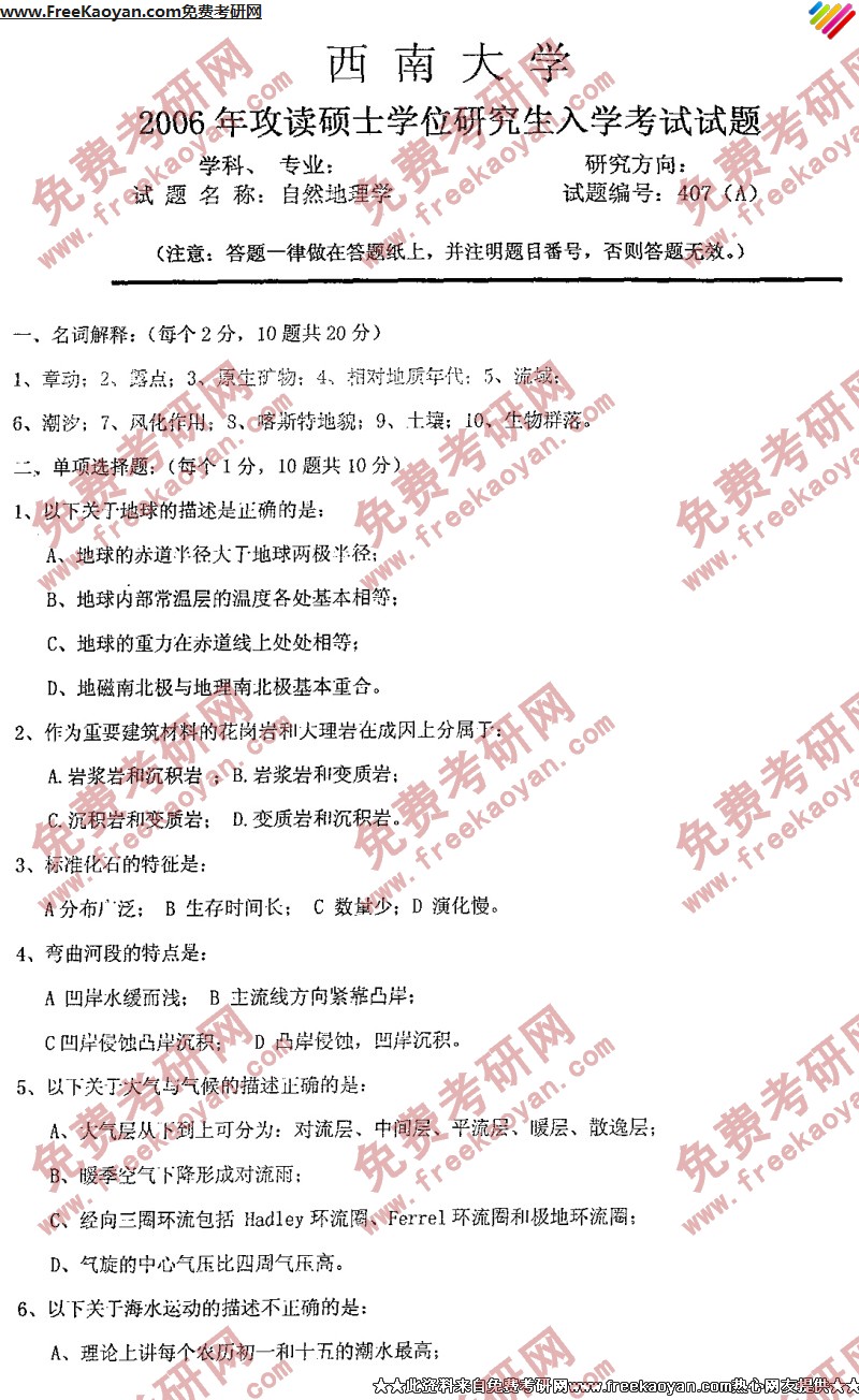 西南大学2006年半岛在线注册真题-自然地理学407a