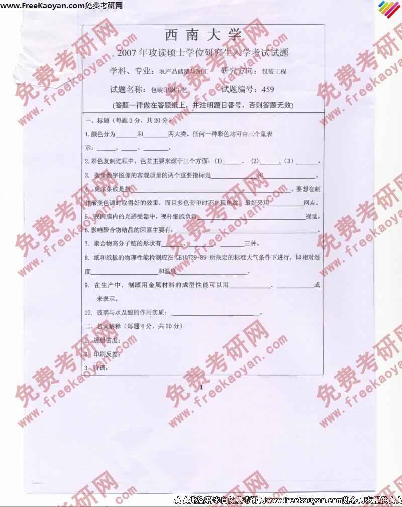 西南大学2007年半岛在线注册真题-包装印刷工艺