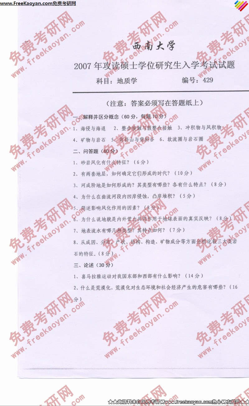 西南大学2007年半岛在线注册真题-地质学