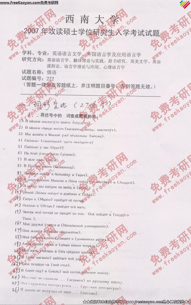 专业课半岛在线注册经验 本站小编 FreeKaoyan 2018-01-23西南大学2007年半岛在线注册真题-德语
