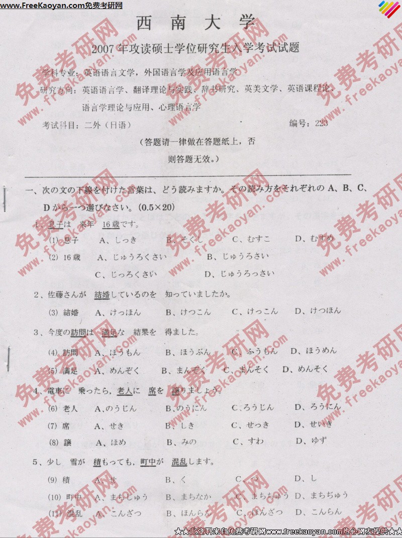 专业课半岛在线注册经验 本站小编 FreeKaoyan 2018-01-23西南大学2007年半岛在线注册真题-单考英语211-221