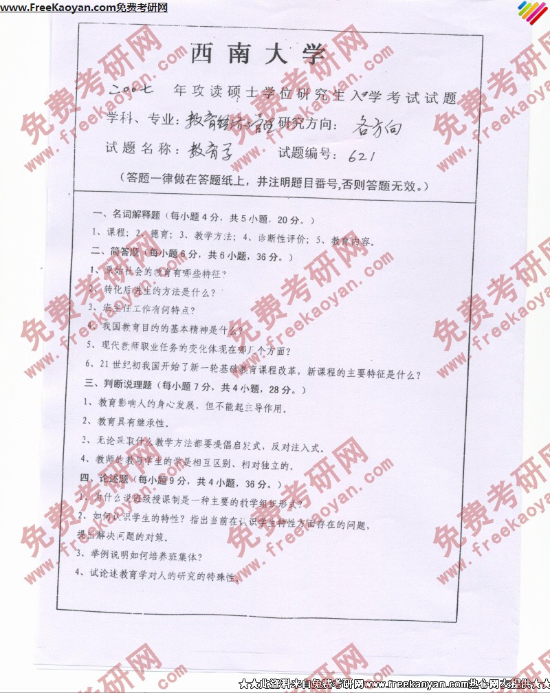 专业课半岛在线注册经验 本站小编 FreeKaoyan 2018-01-23西南大学2007年半岛在线注册真题-化学