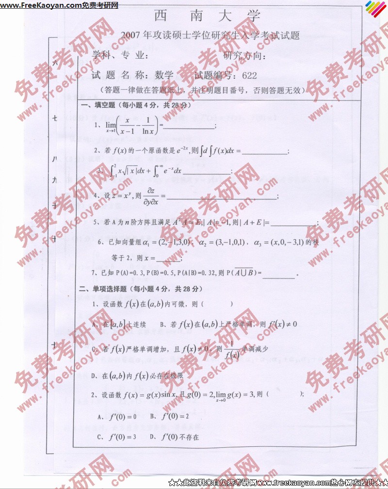 西南大学2007年半岛在线注册真题-数学