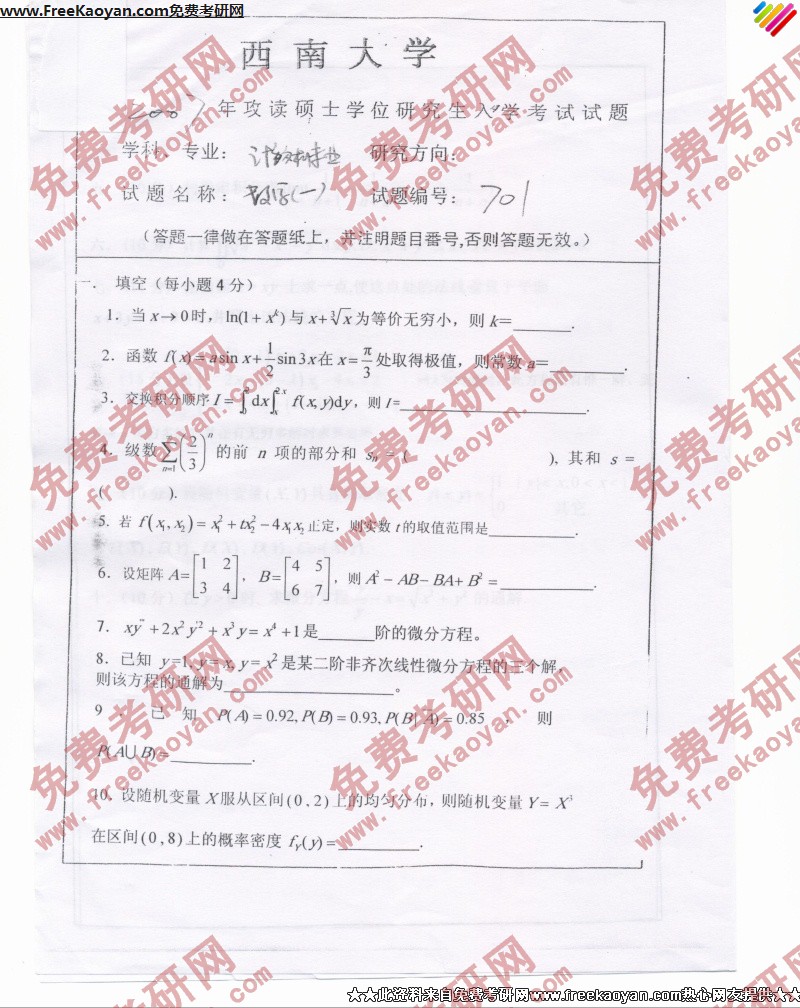 专业课半岛在线注册经验 本站小编 FreeKaoyan 2018-01-23西南大学2007年半岛在线注册真题-数学