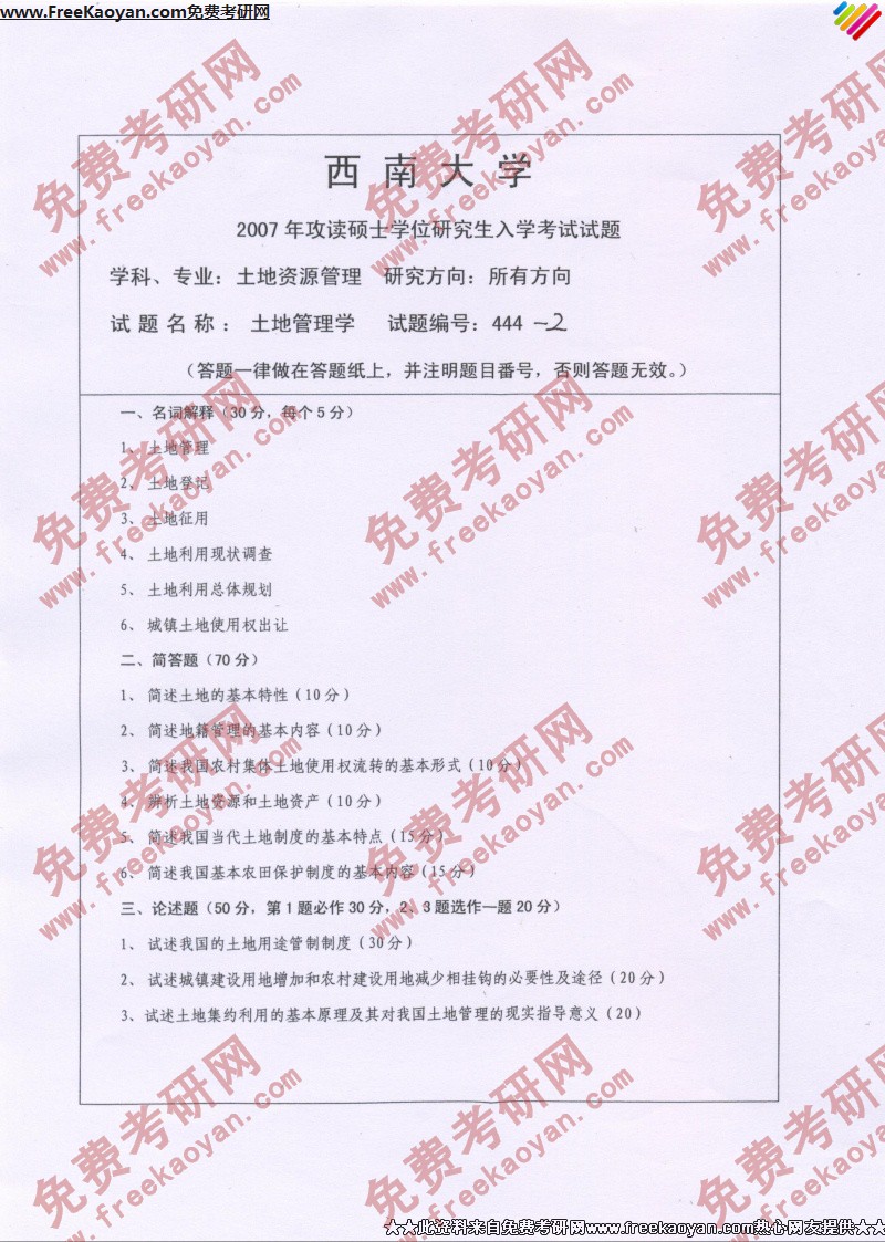 西南大学2007年半岛在线注册真题-土地管理学444-2