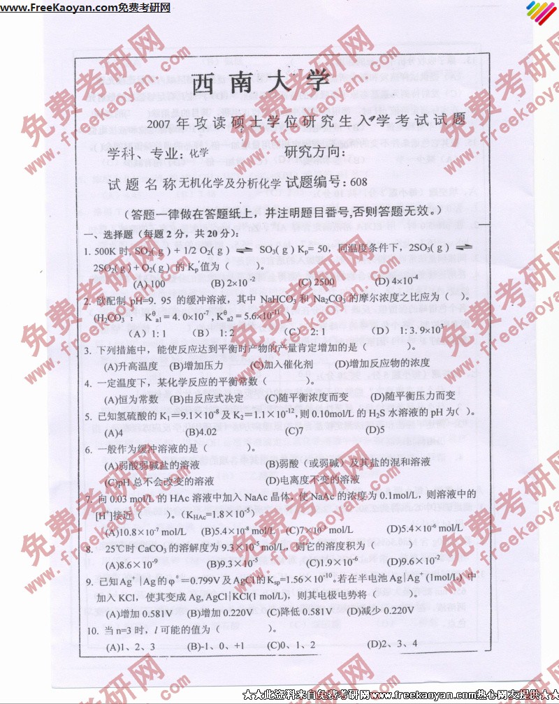 相关话题/半岛在线注册真题 西南大学 分析化学 无机化学