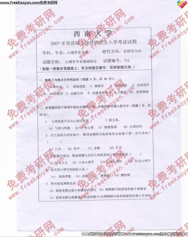 西南大学2007年半岛在线注册真题-心理学专业基础综合
