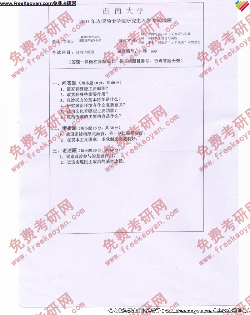 专业课半岛在线注册经验 本站小编 FreeKaoyan 2018-01-23西南大学2007年半岛在线注册真题-政治