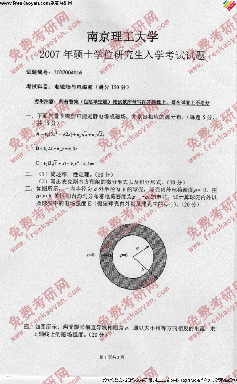 南京理工大学2007年半岛在线注册真题-电磁场与电磁波