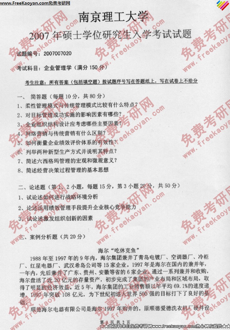 南京理工大学2007年半岛在线注册真题-企业管理学