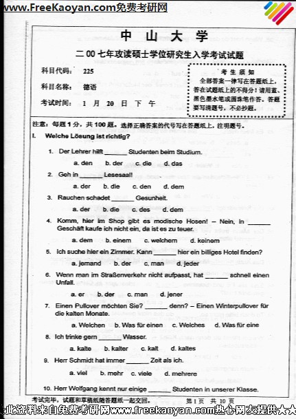 中山大学2007年半岛在线注册真题-德语
