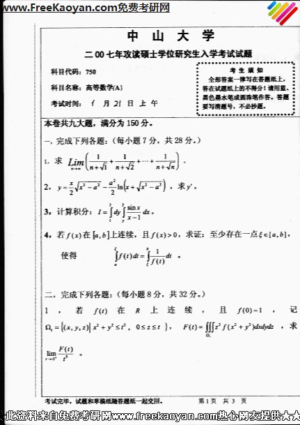 中山大学2007年半岛在线注册真题-高等数学(A)