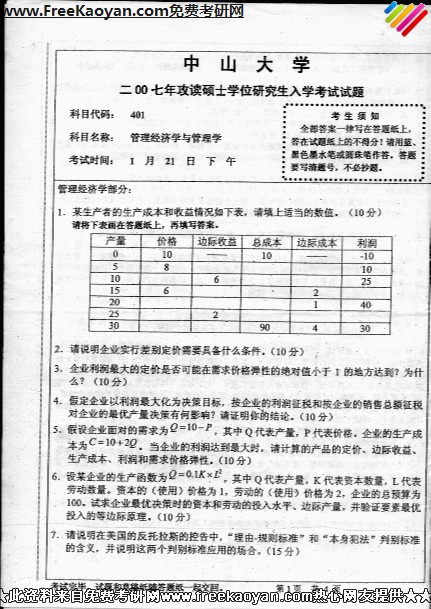中山大学2007年半岛在线注册真题-管理经济学与管理学