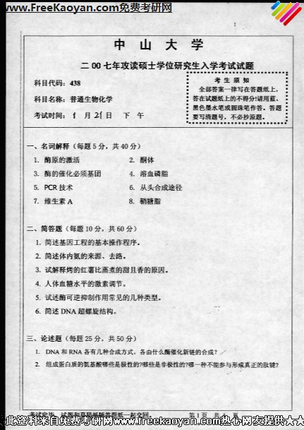 中山大学2007年半岛在线注册真题-普通生物化学