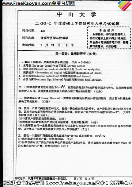 中山大学2007年半岛在线注册真题-微观经济学与管理学