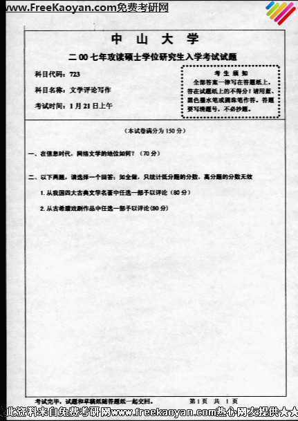 专业课半岛在线注册经验 本站小编 FreeKaoyan 2018-01-23中山大学2007年半岛在线注册真题-文学理论(含中西文论)