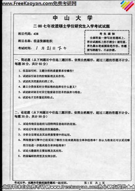中山大学2007年半岛在线注册真题-信息资源组织