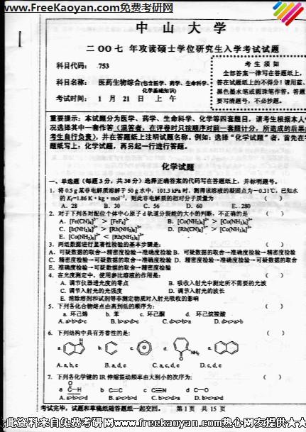 中山大学2007年半岛在线注册真题-医药生物综合(包含医学、药学、生命科学、化学系出知识)