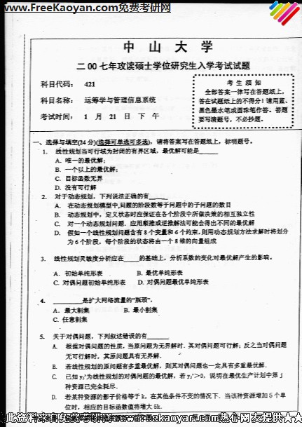 中山大学2007年半岛在线注册真题-运筹学与信息管理系统