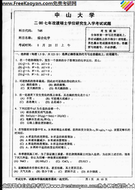 中山大学2007年半岛在线注册真题-综合化学