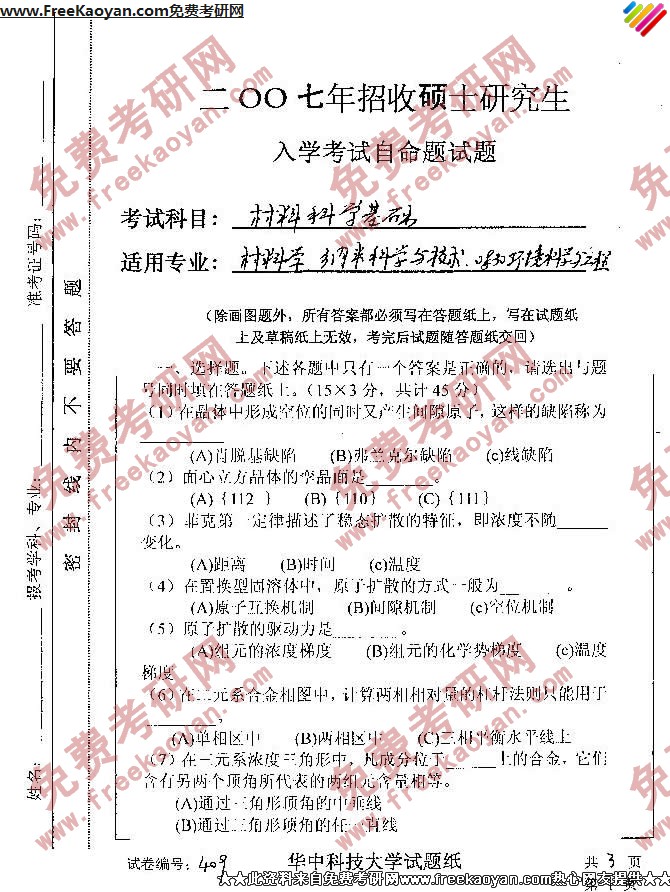 华中科技大学2007年半岛在线注册真题-材料科学基础