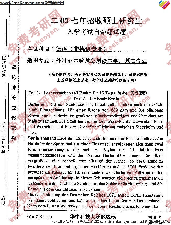 专业课半岛在线注册经验 本站小编 FreeKaoyan 2018-01-23华中科技大学2007年半岛在线注册真题-德语