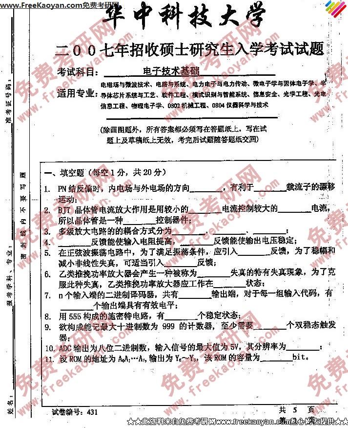 华中科技大学2007年半岛在线注册真题-电子技术基础