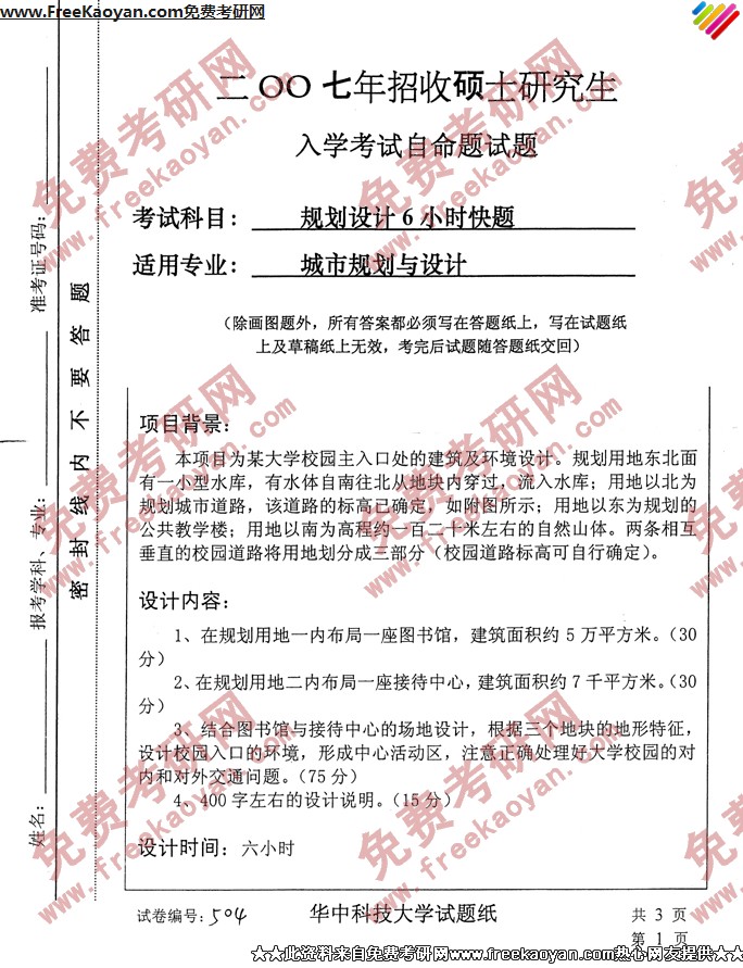 华中科技大学2007年半岛在线注册真题-规划设计6小时快题504