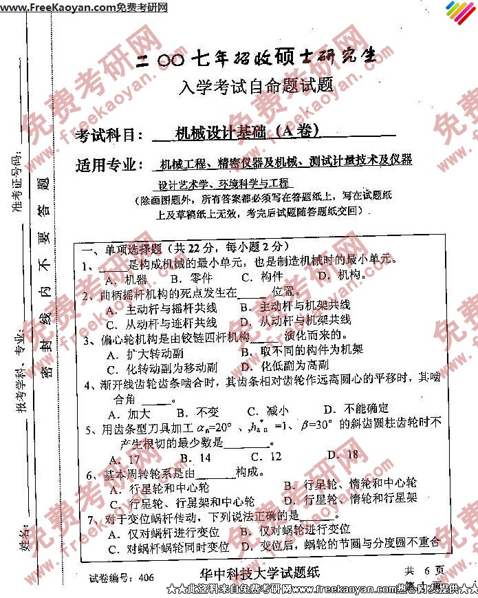 华中科技大学2007年半岛在线注册真题-机械设计基础