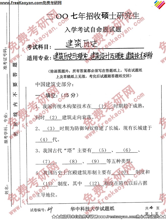 华中科技大学2007年半岛在线注册真题-建筑历史