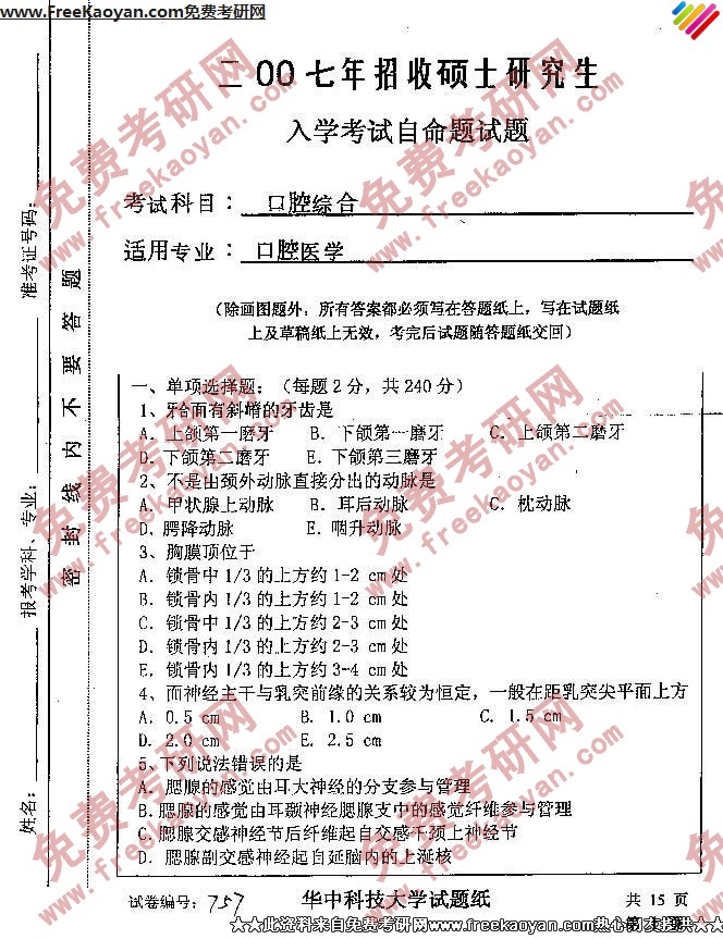 华中科技大学2007年半岛在线注册真题-口腔综合