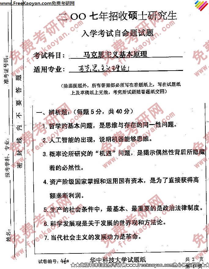 华中科技大学2007年半岛在线注册真题-马克思主义基本原理