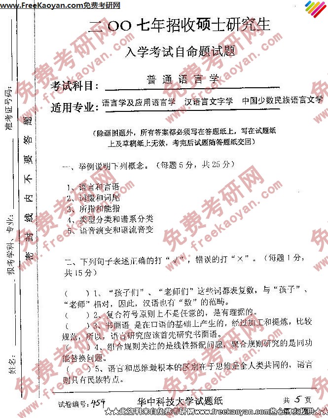 华中科技大学2007年半岛在线注册真题-普通语言学