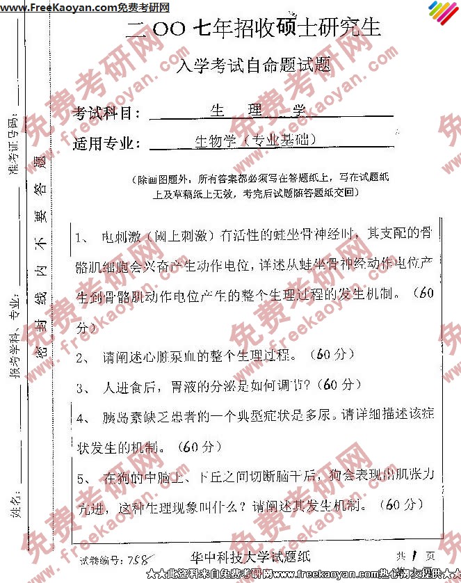 华中科技大学2007年半岛在线注册真题-生理学