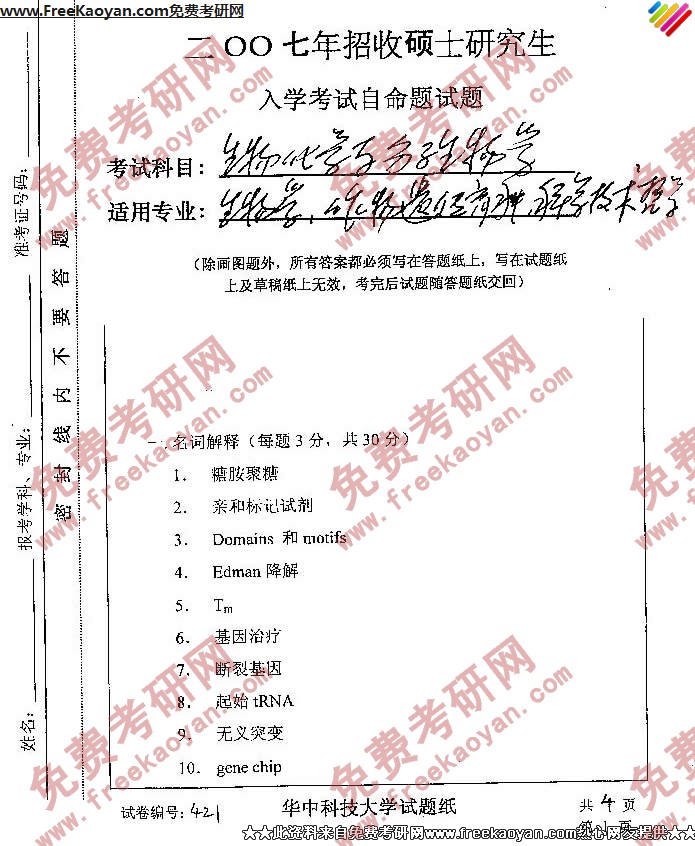 华中科技大学2007年半岛在线注册真题-生物化学与分子生物学
