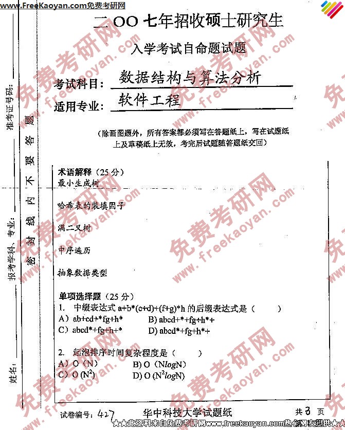 华中科技大学2007年半岛在线注册真题-数据结构与算法分析