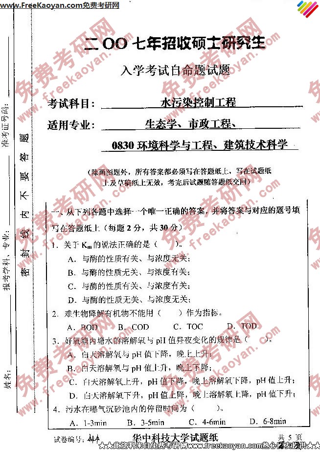 华中科技大学2007年半岛在线注册真题-水污染控制工程