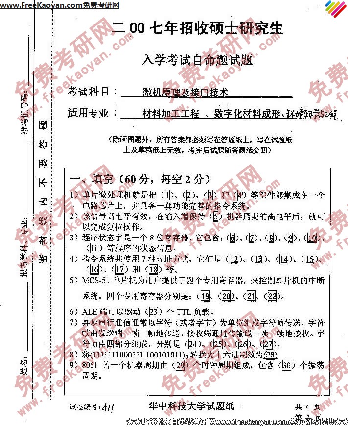 华中科技大学2007年半岛在线注册真题-微机原理