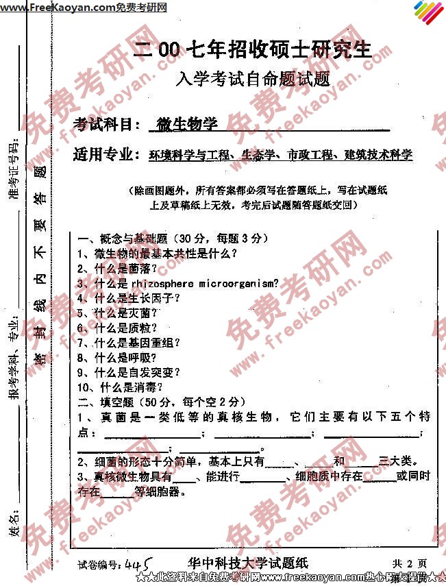 专业课半岛在线注册经验 本站小编 FreeKaoyan 2018-01-23华中科技大学2007年半岛在线注册真题-生物综合