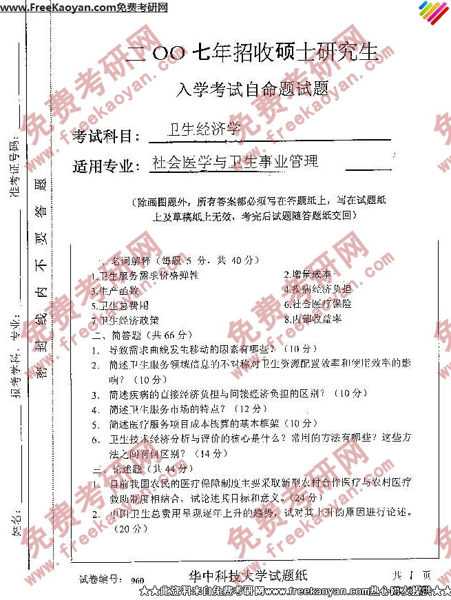华中科技大学2007年半岛在线注册真题-卫生经济学