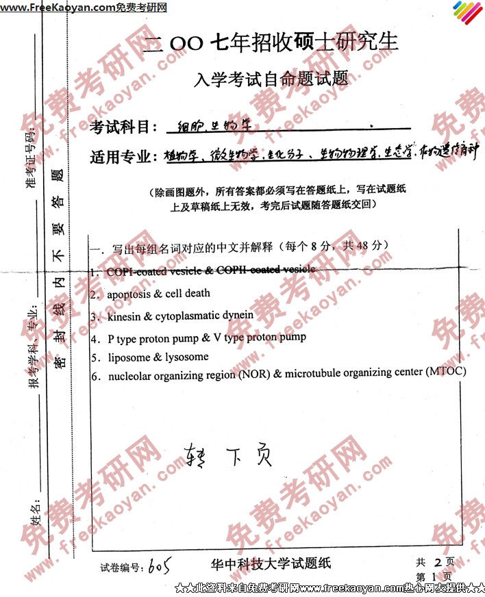 华中科技大学2007年半岛在线注册真题-细胞生物学