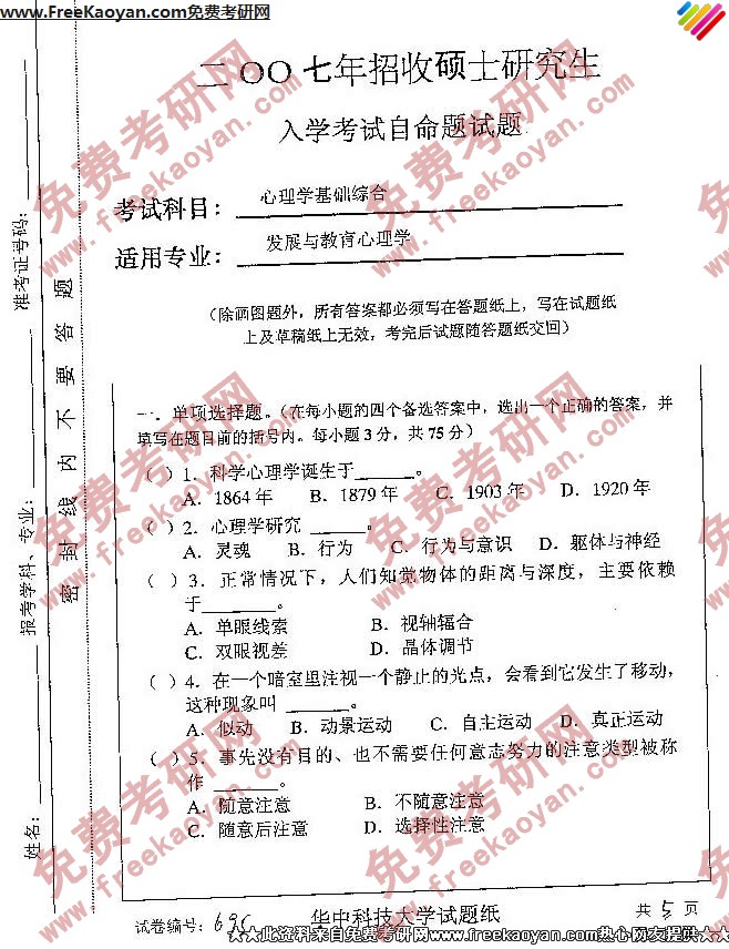 华中科技大学2007年半岛在线注册真题-心理学基础综合