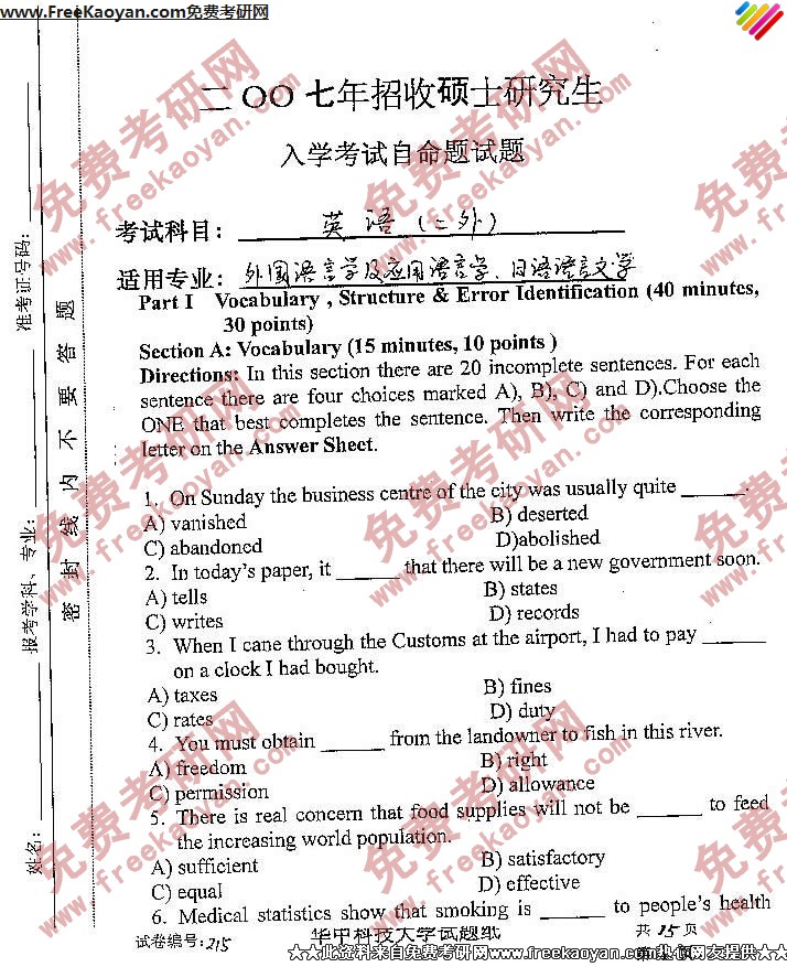 华中科技大学2007年半岛在线注册真题-英语(二外)