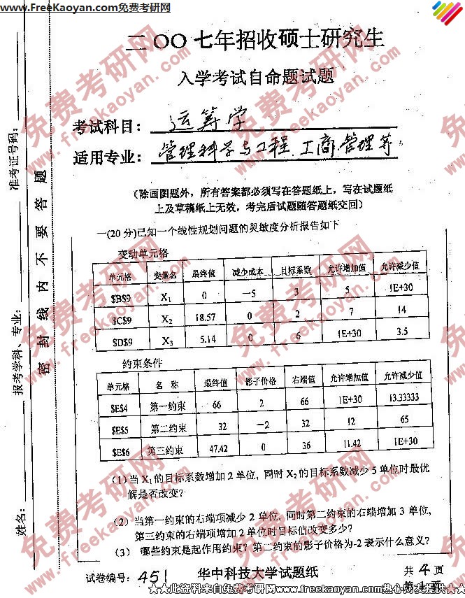 华中科技大学2007年半岛在线注册真题-运筹学451