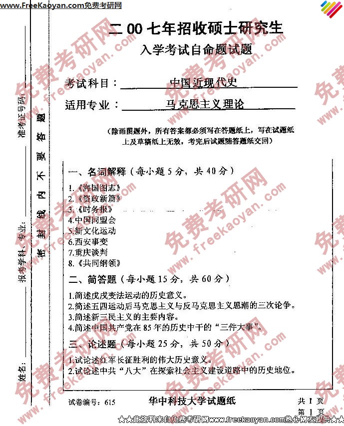 华中科技大学2007年半岛在线注册真题-中国近现代史