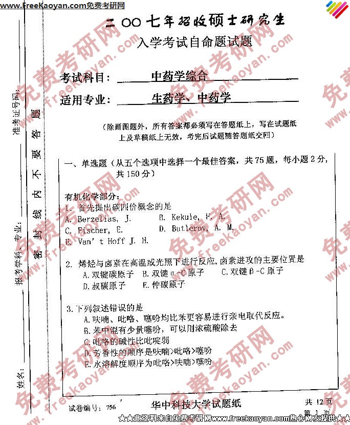 专业课半岛在线注册经验 本站小编 FreeKaoyan 2018-01-23华中科技大学2007年半岛在线注册真题-药学综合
