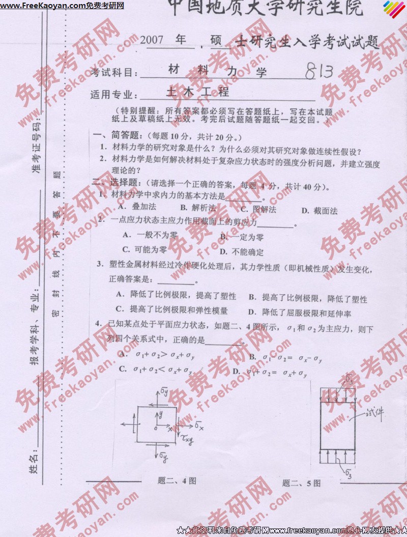 中国地质大学(武汉)2007年半岛在线注册真题-材料力学