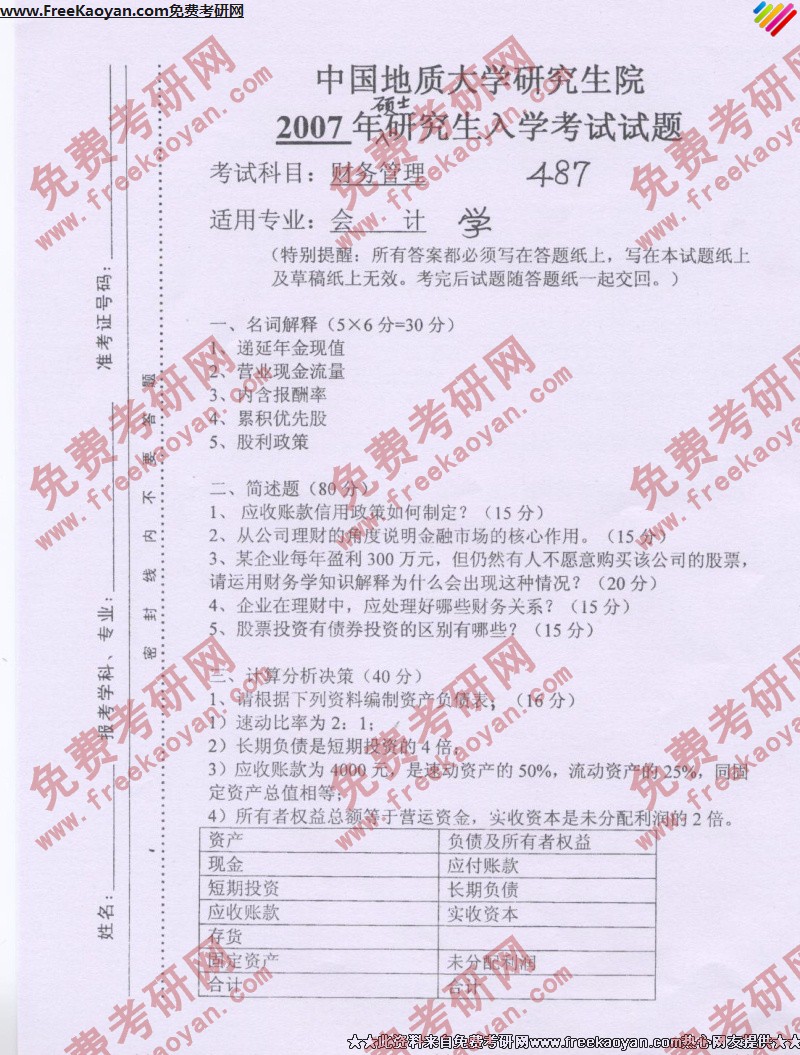 中国地质大学(武汉)2007年半岛在线注册真题-财务管理